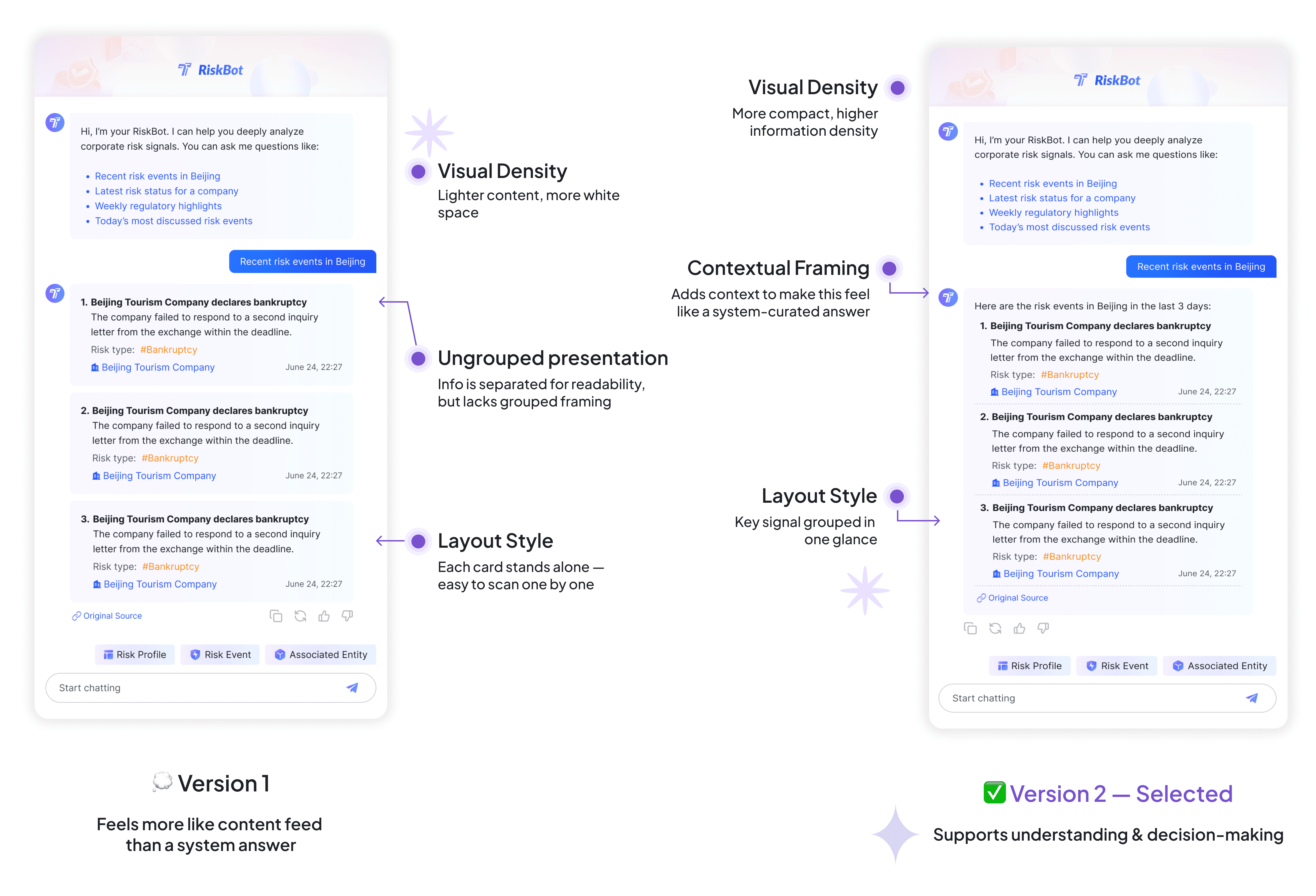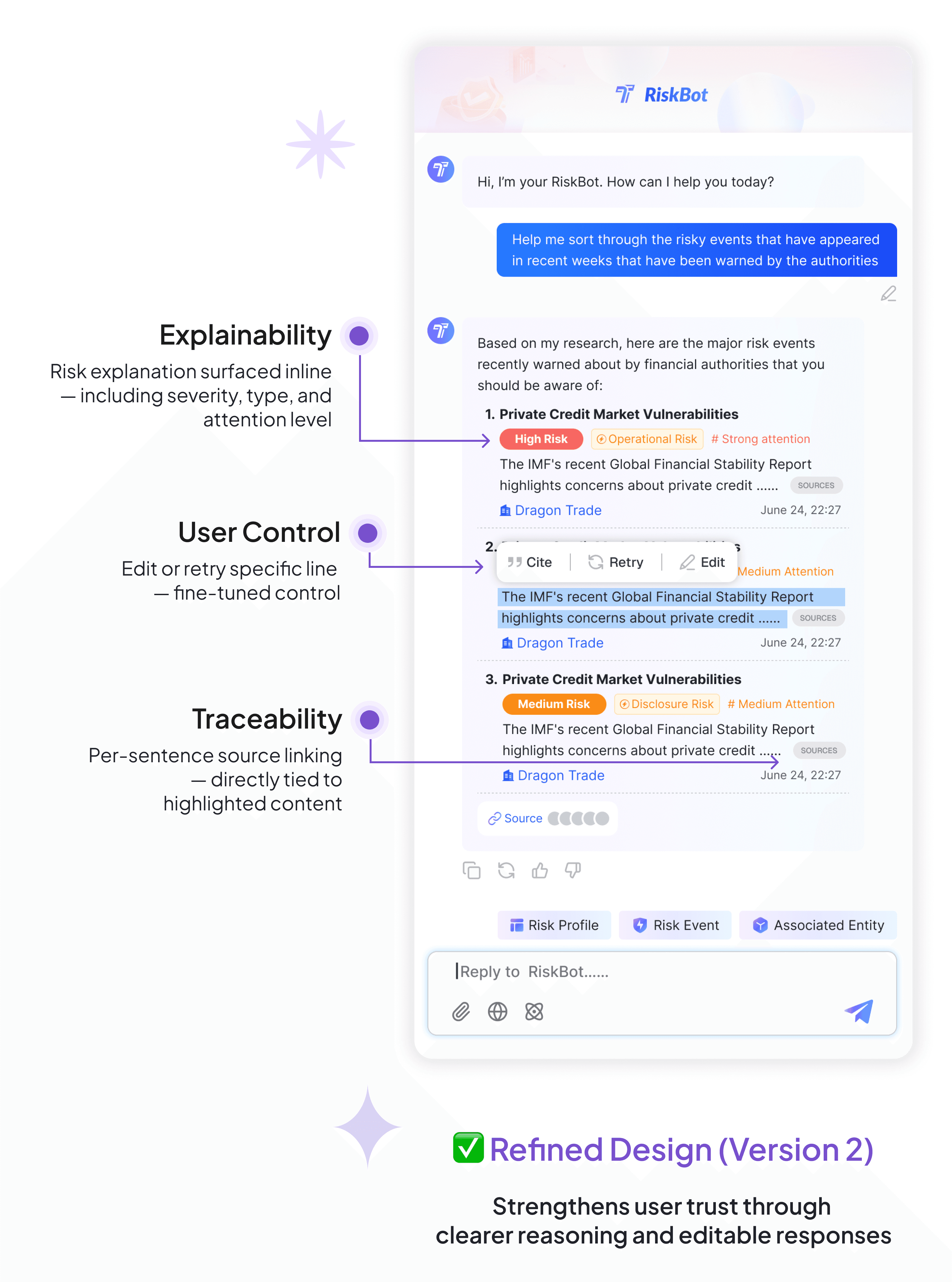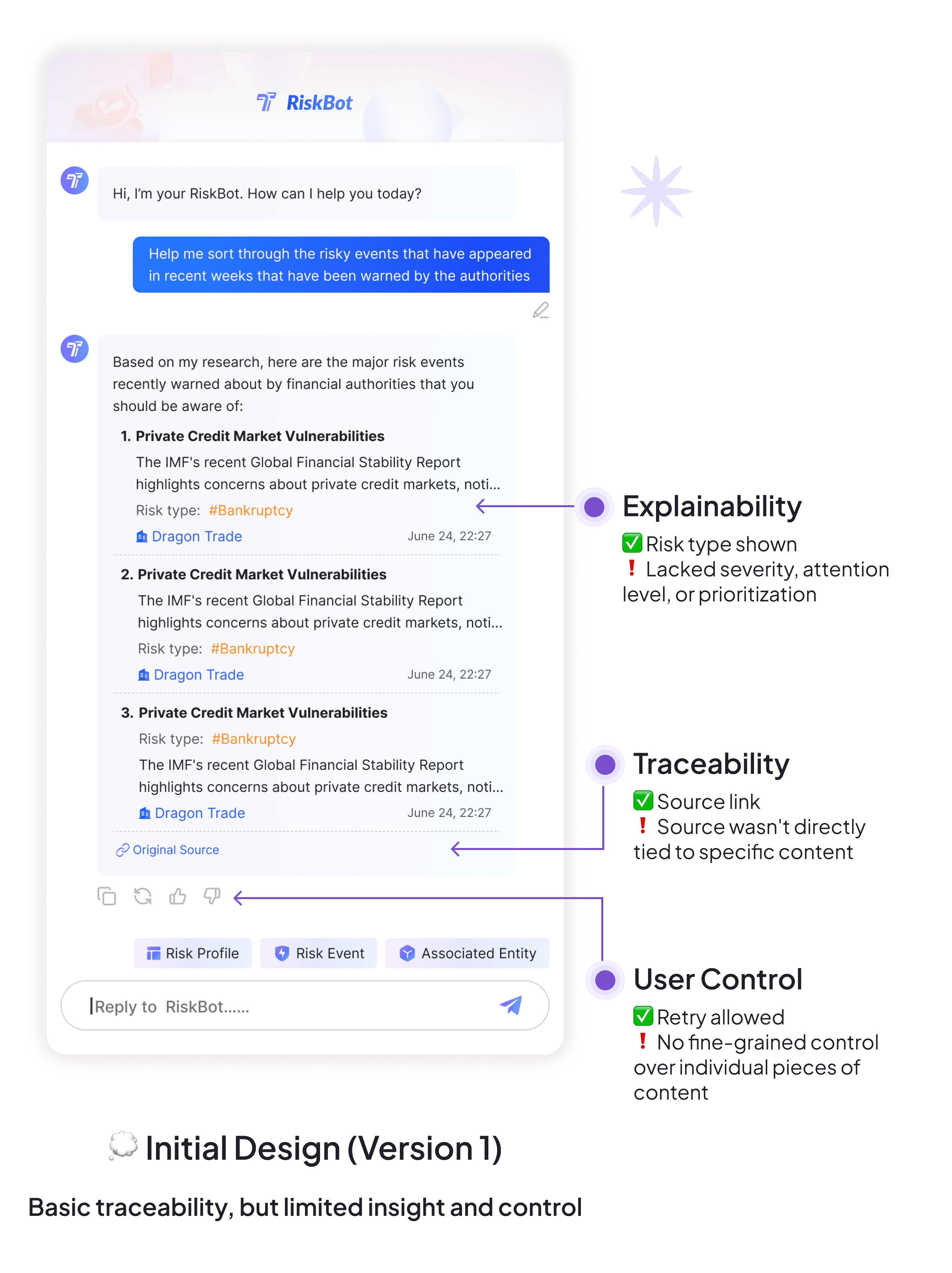 In a financial risk context, any AI-generated insight must be verifiable. Users needed clear traceability before they could trust the output.