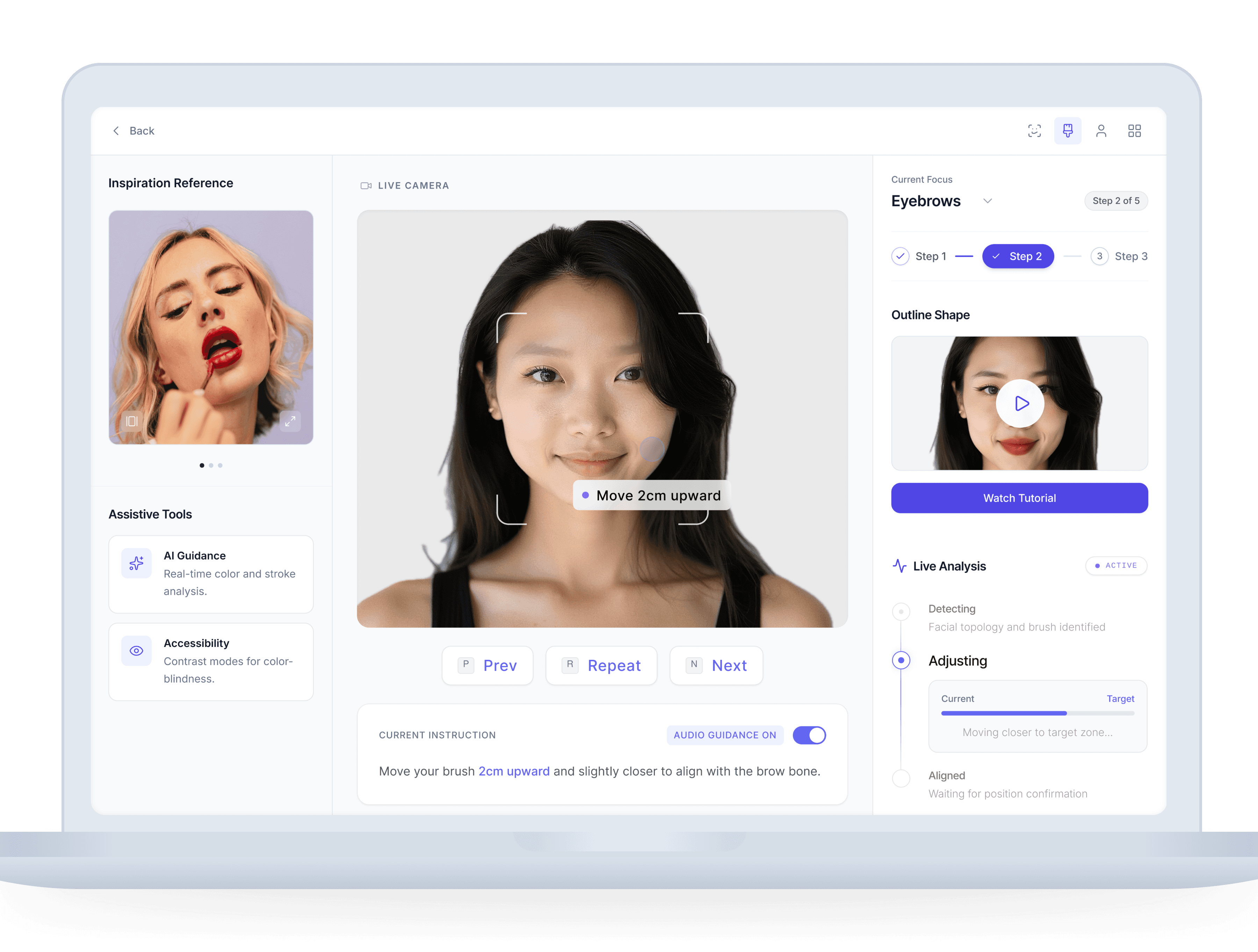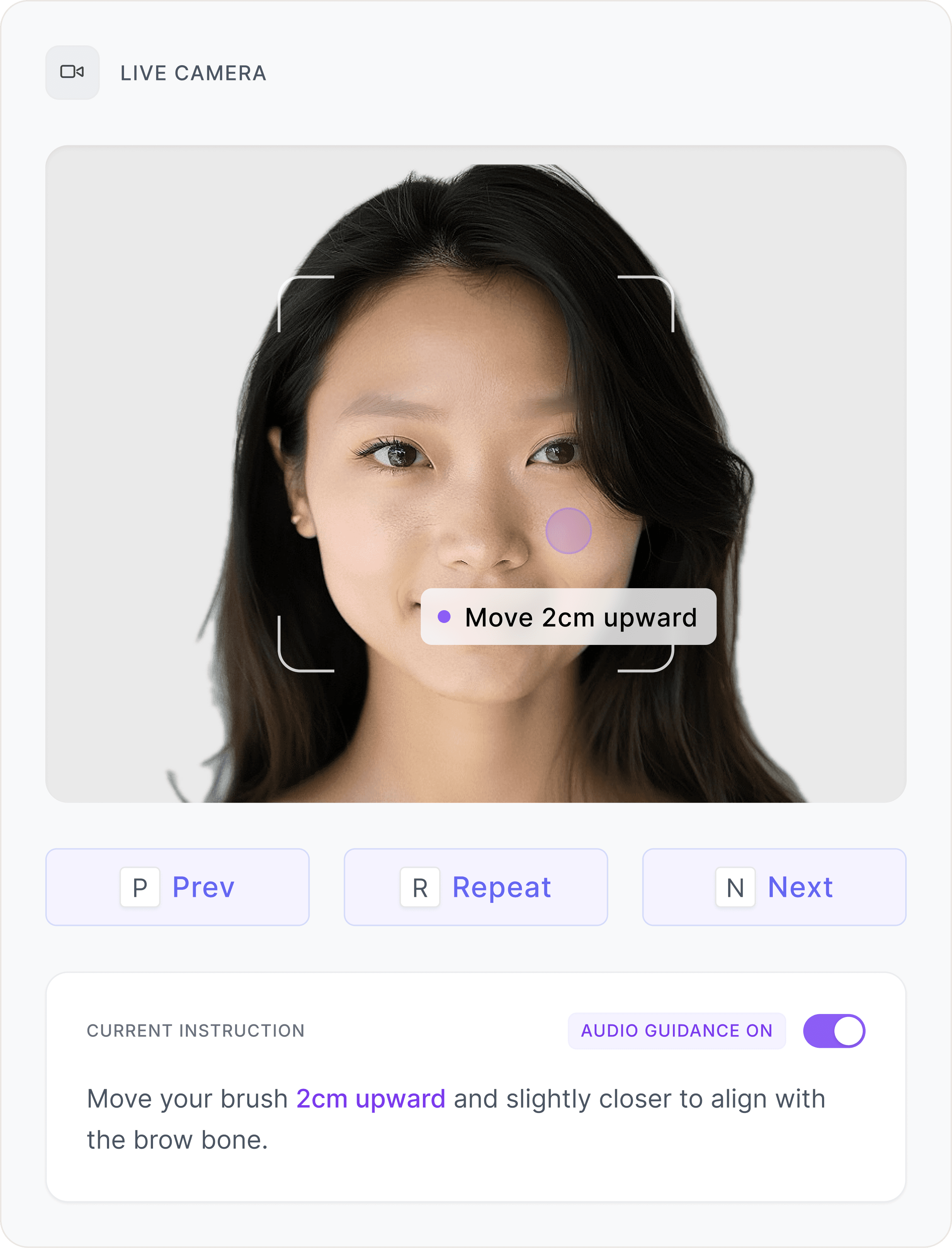 Dynamic arrows and numeric distance indicators (e.g., "2cm upward") replace vague visual framing, providing actionable micro-adjustments.