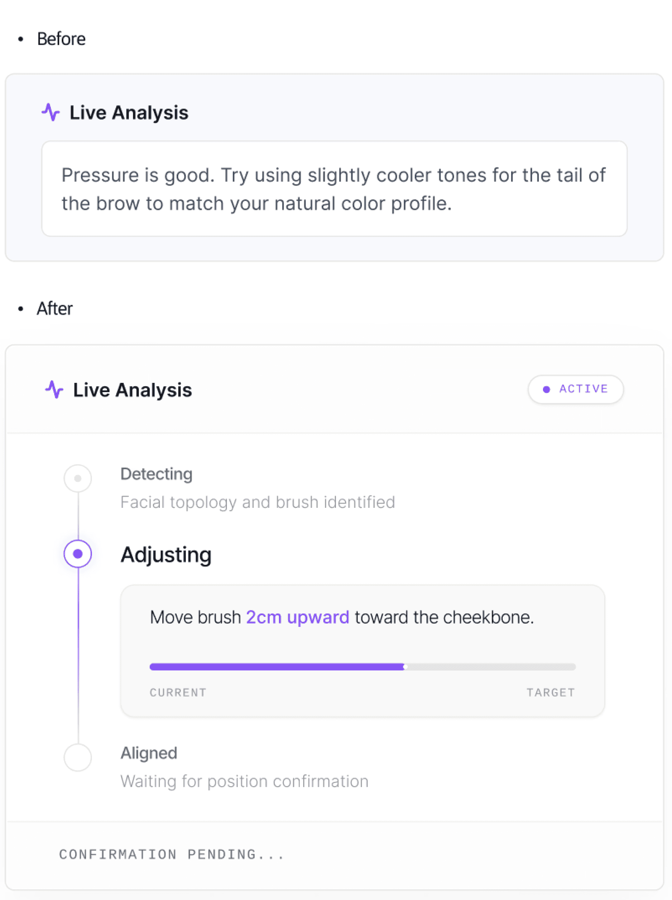 Feedback is structured into clear system states — Detecting, Adjusting, Aligned — replacing ambiguity with visible updates.