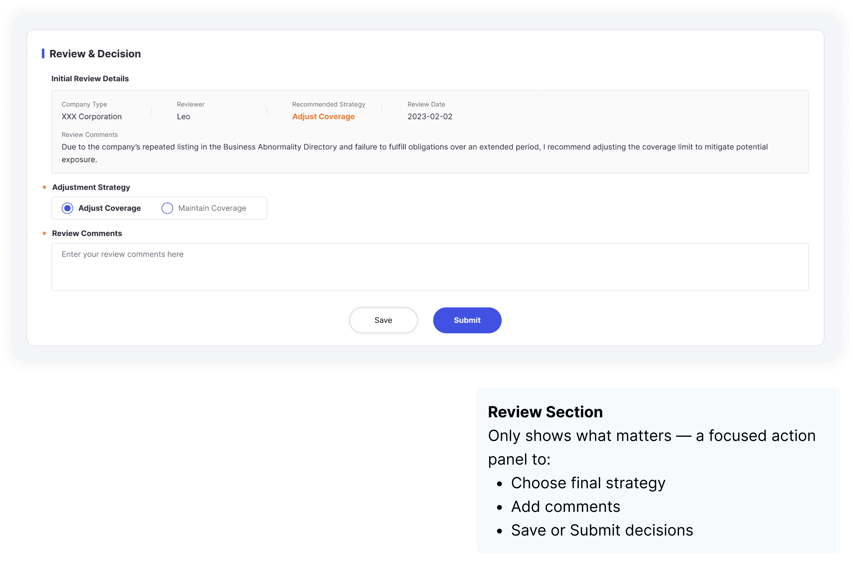 I focused on reducing friction — preserving initial input, removing unnecessary fields, and showing only what’s needed to validate or escalate a decision.